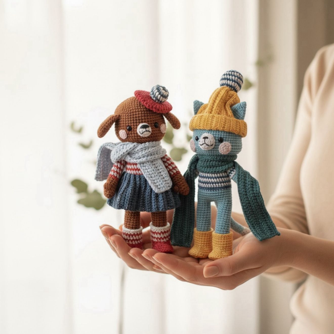 Create two adorable friends — a cozy puppy in a skirt and scarf, and a charming cat in a hat and boots. Each has their own personality and outfit, making this pattern a delightful duo to crochet. Perfect for kids, collectors, or anyone who loves handmade cuteness!